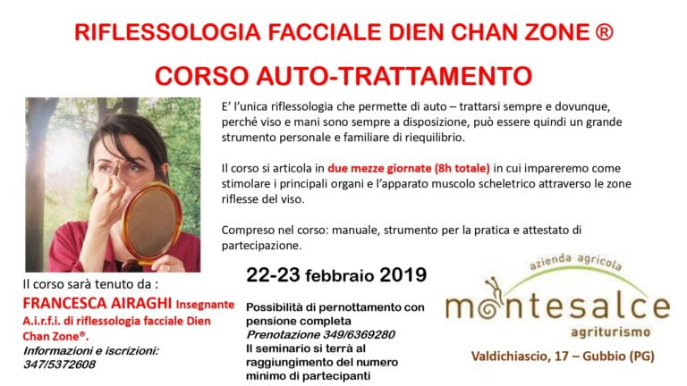 RIFLESSOLOGIA FACCIALE CORSO AUTO – TRATTAMENTO DIEN CHAN ZONE® 22/23 Febbraio 2020 Secondo la riflessologia facciale sul volto vi sono ZONE RIFLESSE di tutti gli organi e gli apparati del corpo. In Vietnam, dove è nata questa…